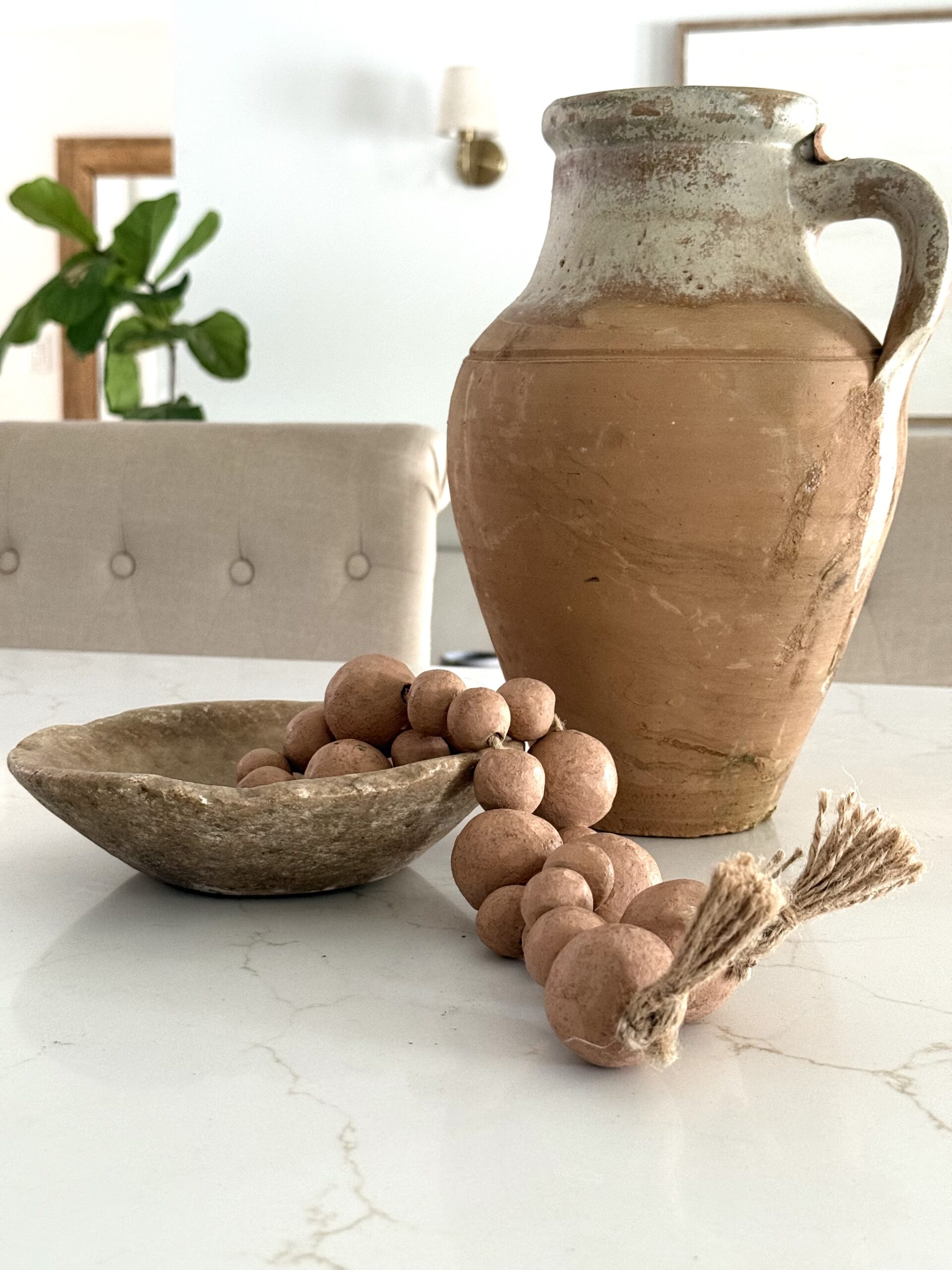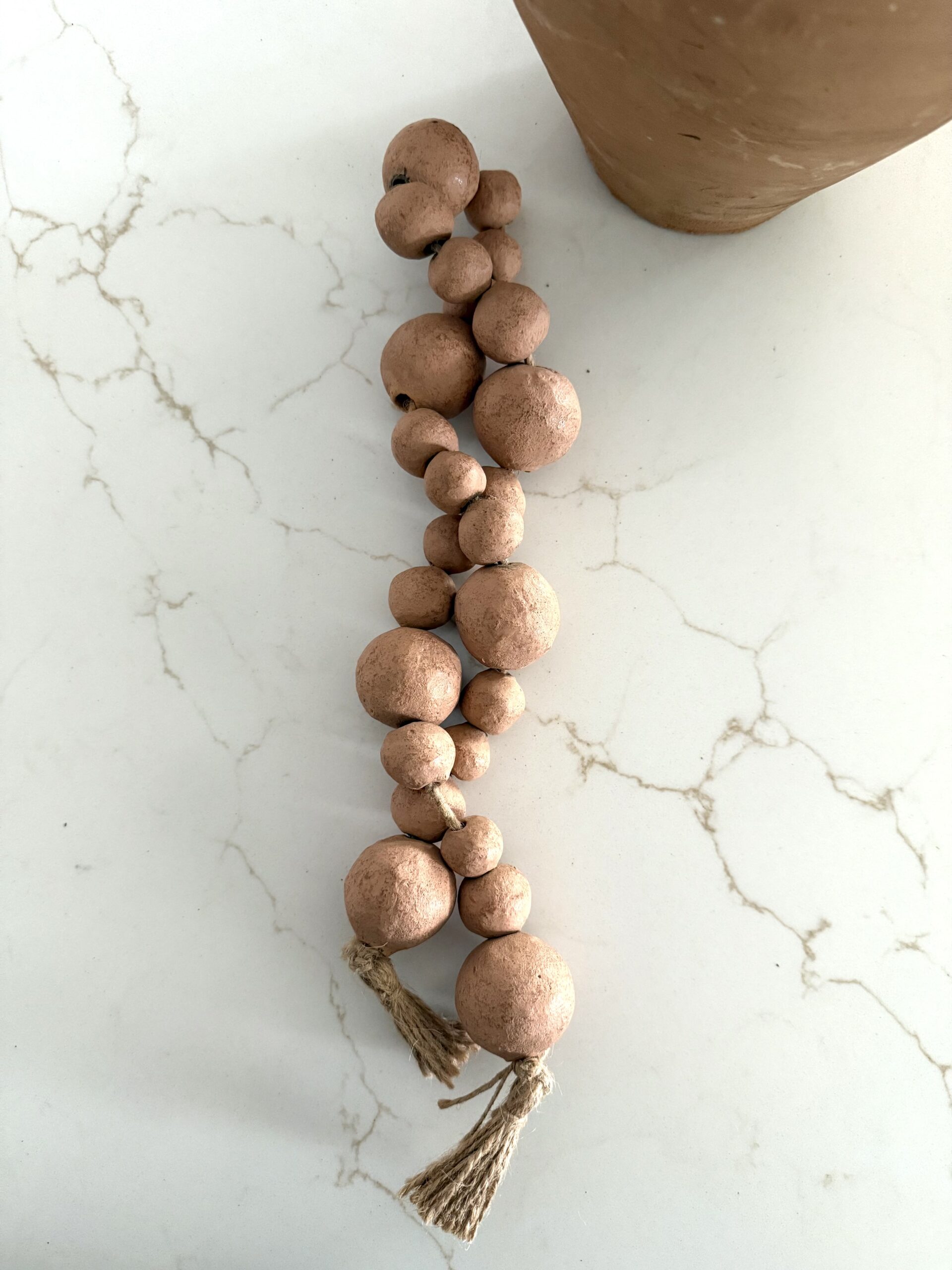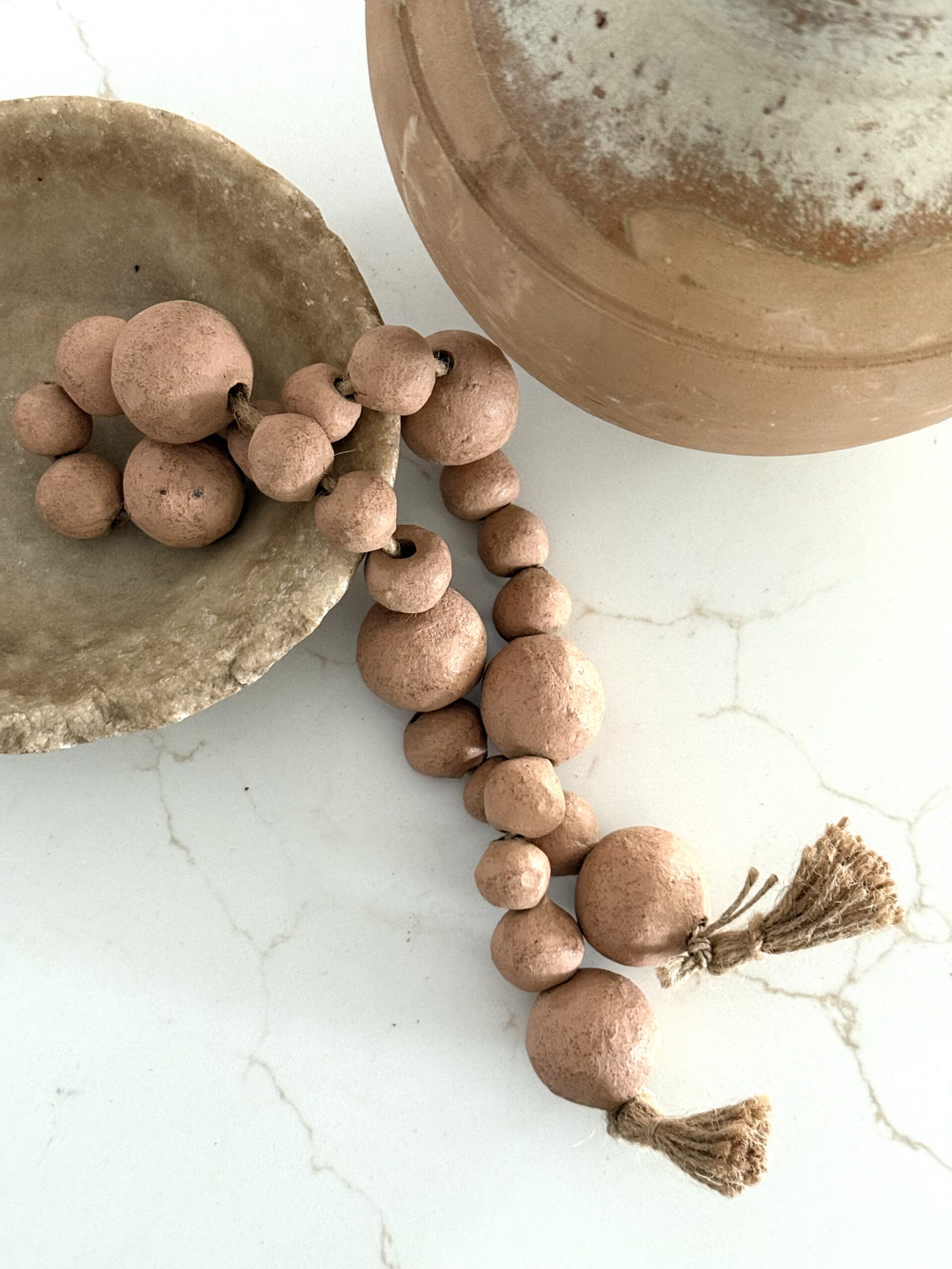 Elevate your décor with the natural charm of this handcrafted clay beaded garland. Each bead is hand-rolled from raw clay and left unglazed to showcase its organic texture and earthy tones. Strung together with natural jute, the garland adds a warm, artisanal touch to mantels, vases, tabletops, or shelving.