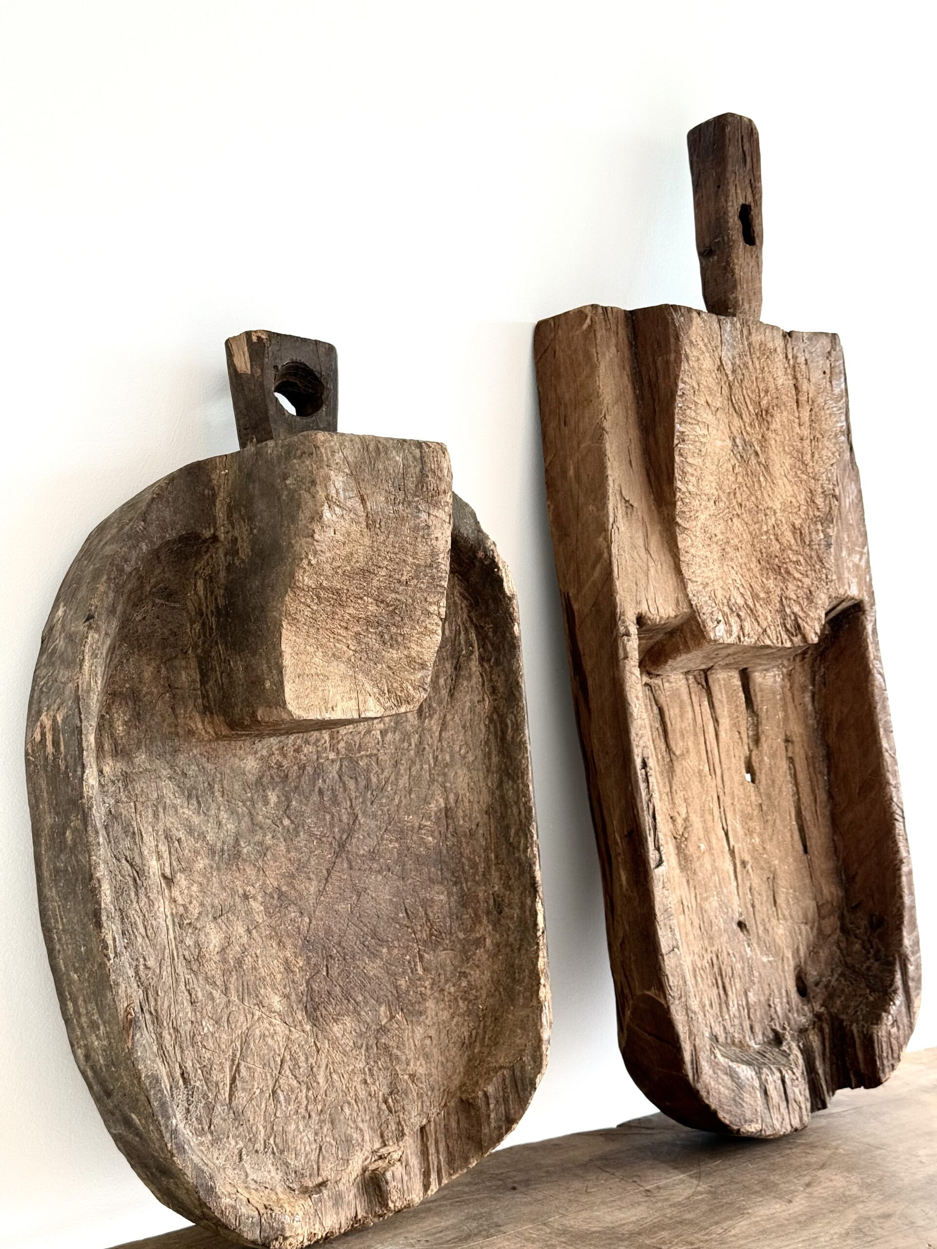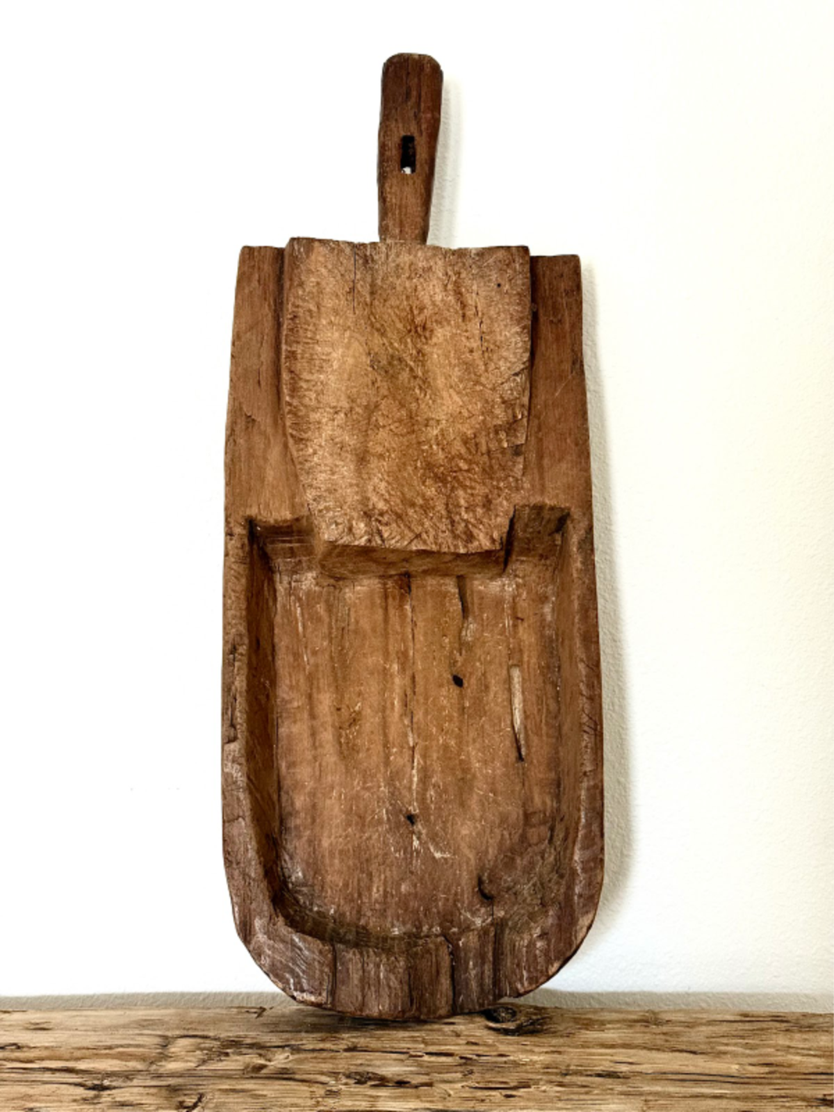 This antique Turkish basin, hand-carved from a single block of hardwood, showcases the utilitarian beauty of traditional craftsmanship. Originally used as a utilitarian wash basin its elongated form and timeworn surface tell a story of generations past. The rich patina, natural cracks, and tool marks add depth and authenticity, making it a striking decorative piece for rustic interiors. Whether displayed on a console, used as a tabletop centerpiece, or repurposed for storage, this one-of-a-kind trough brings warmth, texture, and heritage into any space., Each basin varies in size, colors and shape.